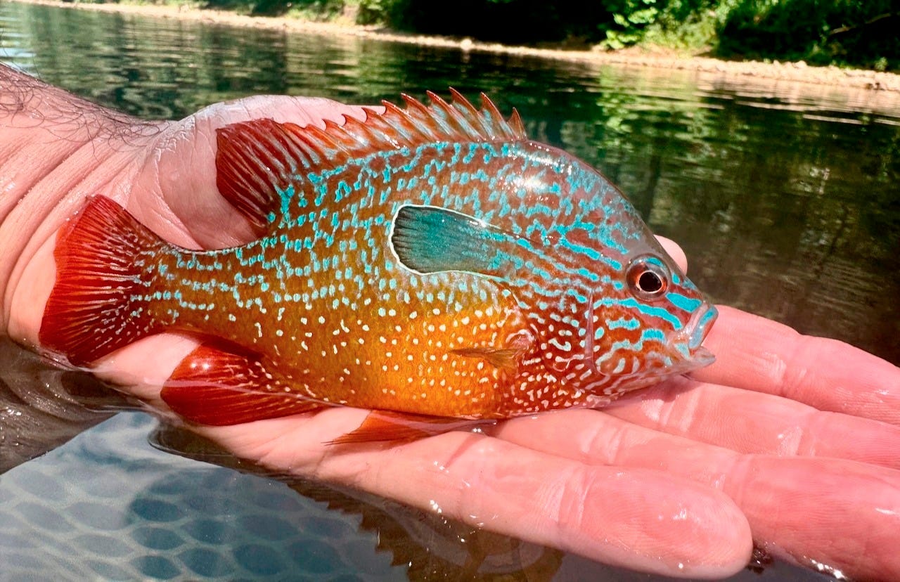 There’s everyone’s first fish, the bluegill, with their dirt-dauber-blue operculum flaps, rosy to mahogany breast, and penny-colored bellies. Green sunfish, often a first fish, too, because every puddle and ditch homes a population, are stunning as well. Picture what looks like a miniature, rounded-off largemouth with a sage-green (hence the name) base, sky-blue specks on the body, peach-colored operculum tips, Tron-blue piping on the face, and accented with fins trimmed in chromium yellow or blaze orange. But the most dazzling of all creek Centrarchidae are the longears, Lepomis megalotis.
